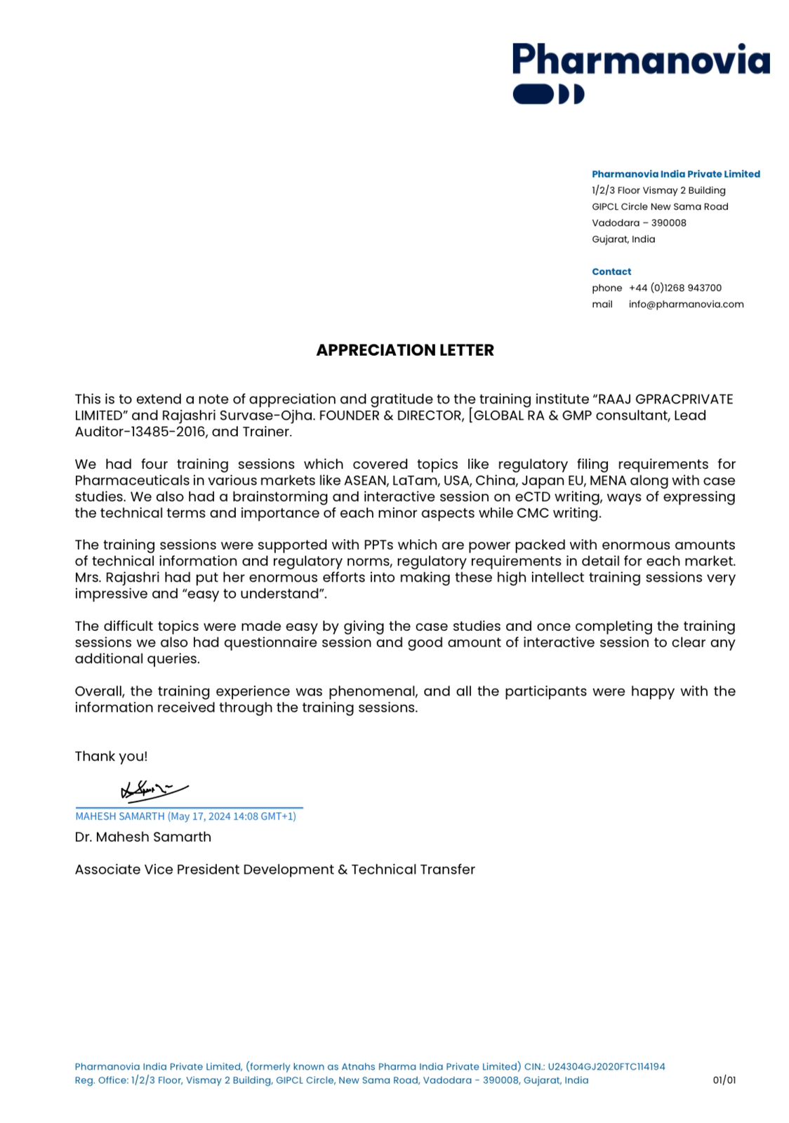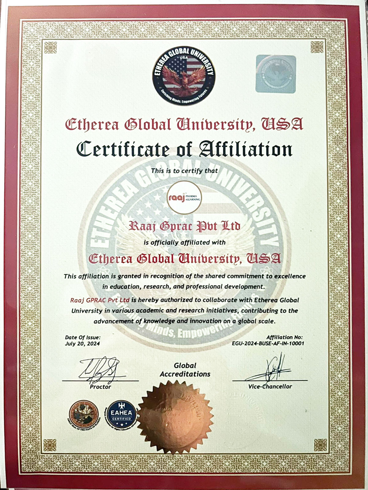 RAAJ GPRAC /RaajpharmaeLearning Affiliated by Etherea Global University, USA !! and Accredited as per ISO 20001-2018. For more details, please contact on